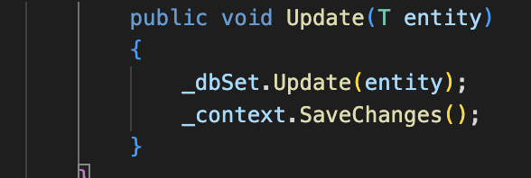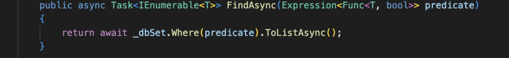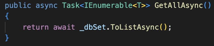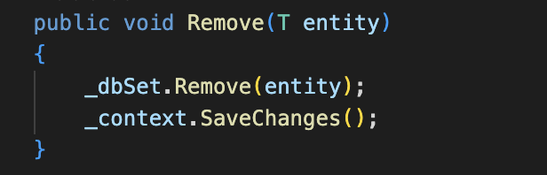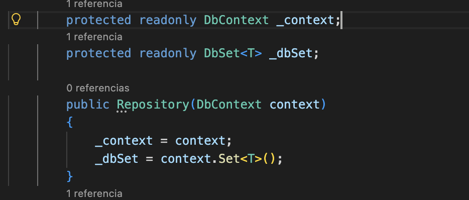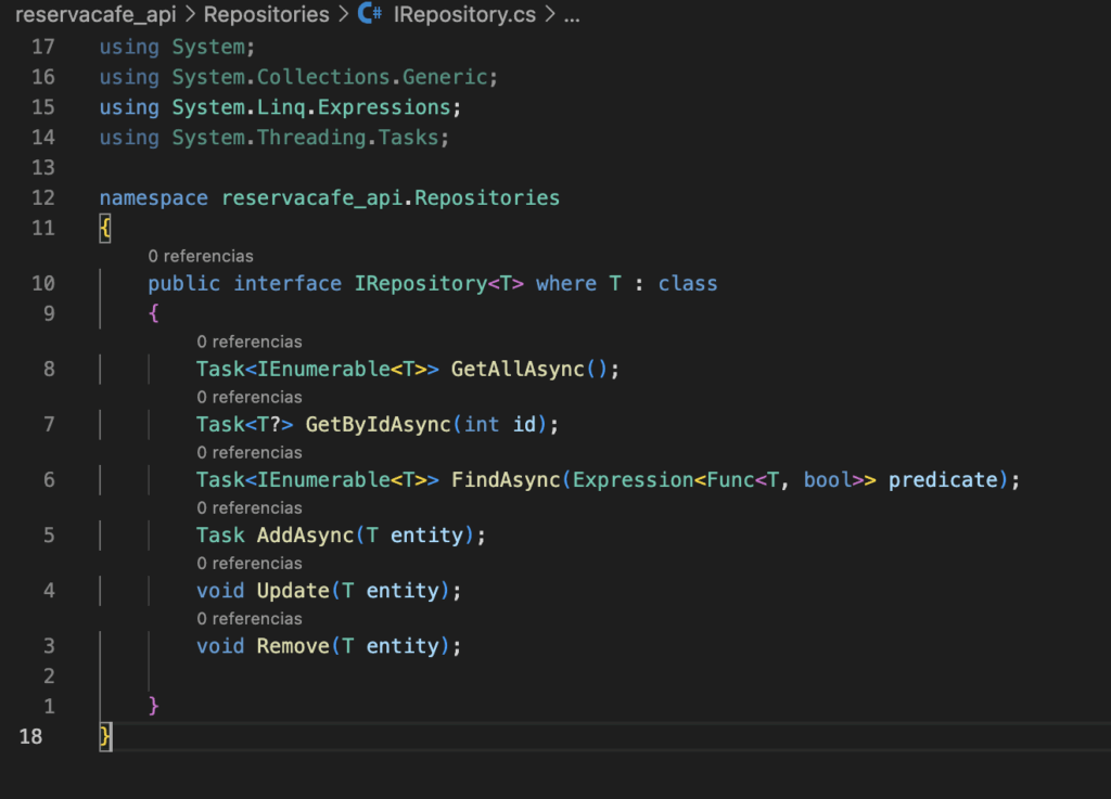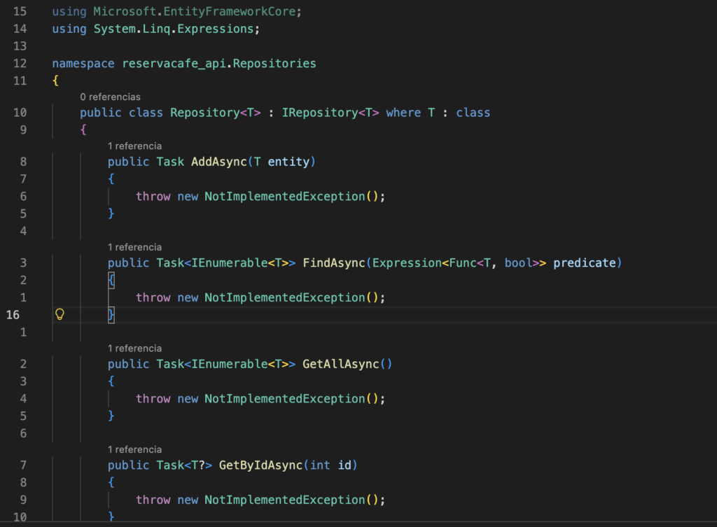 Repository.cs (por defecto Vscode si le das a corrección rápida y tienes los plugins de .NET, ya te ayuda a implementarla, aunque tirará error porque faltará definir los comportamientos, aquí se muestra el ejemplo de «plantilla» de vscode por defecto).
