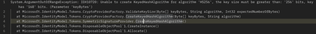 System.ArgumentOutOfRangeException Unable to create KeyedHashAlgorithm for algorithm ‘HS256’