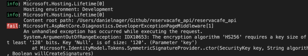 Este error se muestra en el momento de realizar una petición a un método de auth. Se da cuando se configura .NET con una cadena de JWT_SECRET corta para el algoritmo que se quiere utilizar.